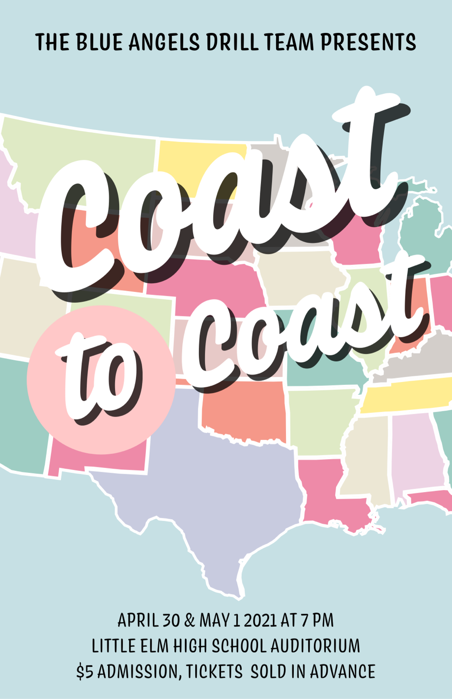 2021 marked the first year I was fully involved in the Spring Show visual design process. In prior years, I'd contributed a poster design only but for Coast to Coast I added additional digital and printed elements. This included a large three-part marquee in the lobby, postcards to fit the travel theme, and an animated version of the logo from the poster.