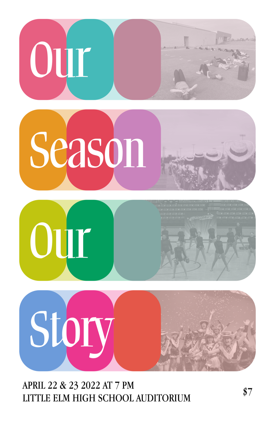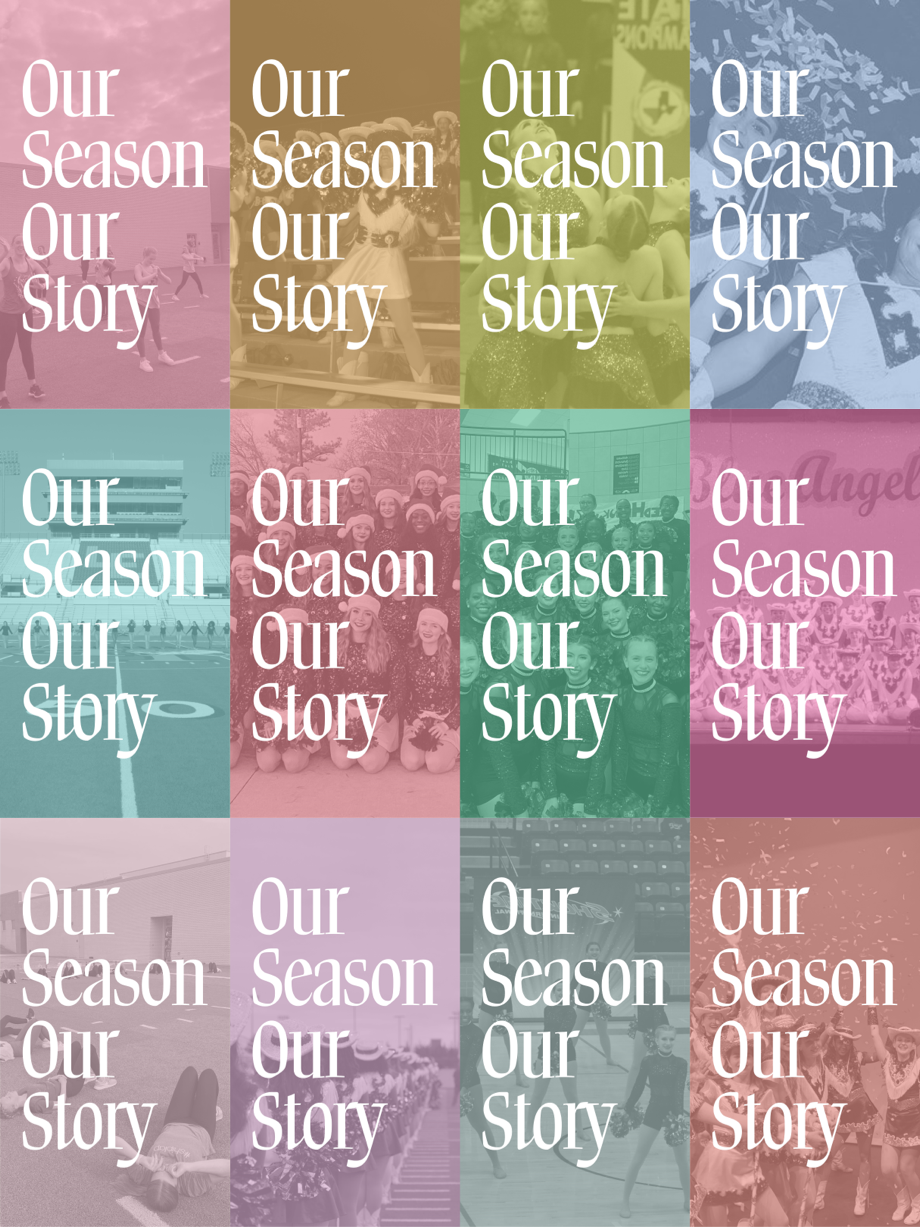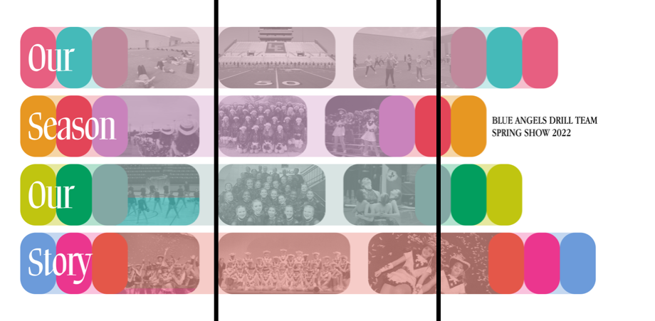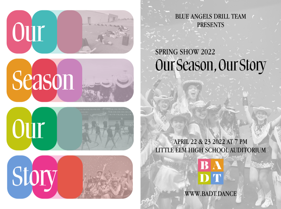 For 2022's Spring Show, I leaned into developing a full design system. This show helped me realize that I am a "systems thinker" in general, but also in design projects. For Our Season, Our Story I continued our use of a variety of colors, and brought in photos from the year. This led to some really great mixes of color and photo across different applications, notably in producing tons of social media assets. The three-part marquee let the poster be revealed to be just one part of the marquee in the lobby, and the format led to some fun animations in the show video elements.