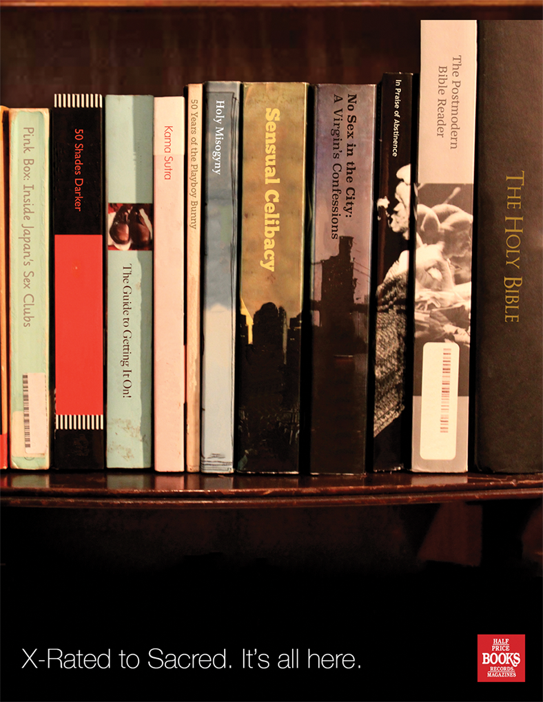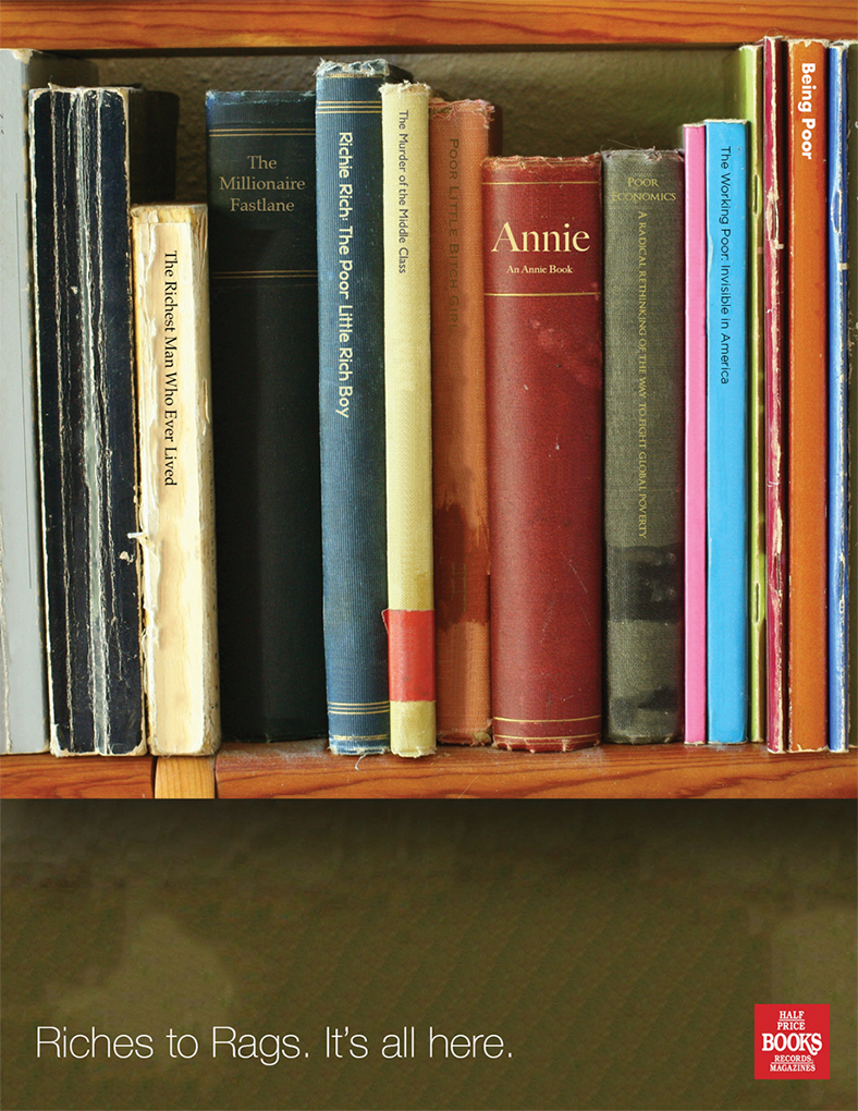 This print campaign showcases the wide range of selections that Half Price Books offers, tying them together with a fun and intelligent theme.