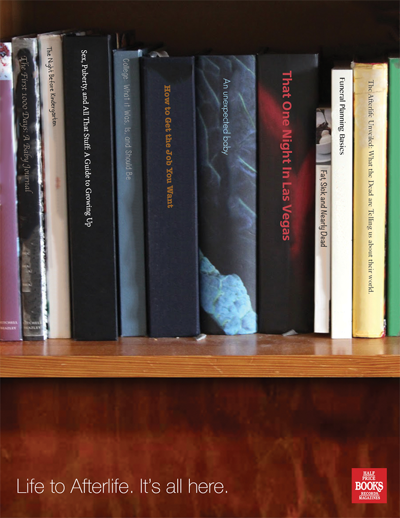 In addition to the final print campaign, we also created a unique promotion idea to promote Half Price Books. It took a similar concept to the print campaign, but instead of using real titles of books it fused two contrasting book titles together.