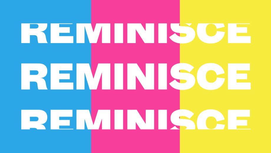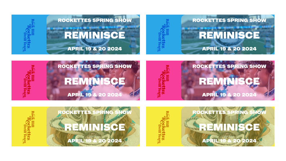 In the fall of 2023, my wife Mallory became the Drill Team Director at Rock Hill High School in Prosper, TX. Reminisce was our first spring show with the Rockettes Drill Team. Featuring vibrant colors layered on top of great photos from the year, the visual design for this show featured a primary CMY(K) color system, and was designed as a system to support the extensive use of a variety of photos from the fall football season. Video screens in the lobby of the auditorium of the show ran a loop of photos with "Reminisce" layered on top, along with a blue, pink, or yellow color overlay. The lobby presented new opportunities to design new things, including signage, additional poster treatments, and personalized scaled down versions of the poster for each team student featuring three photos of them.